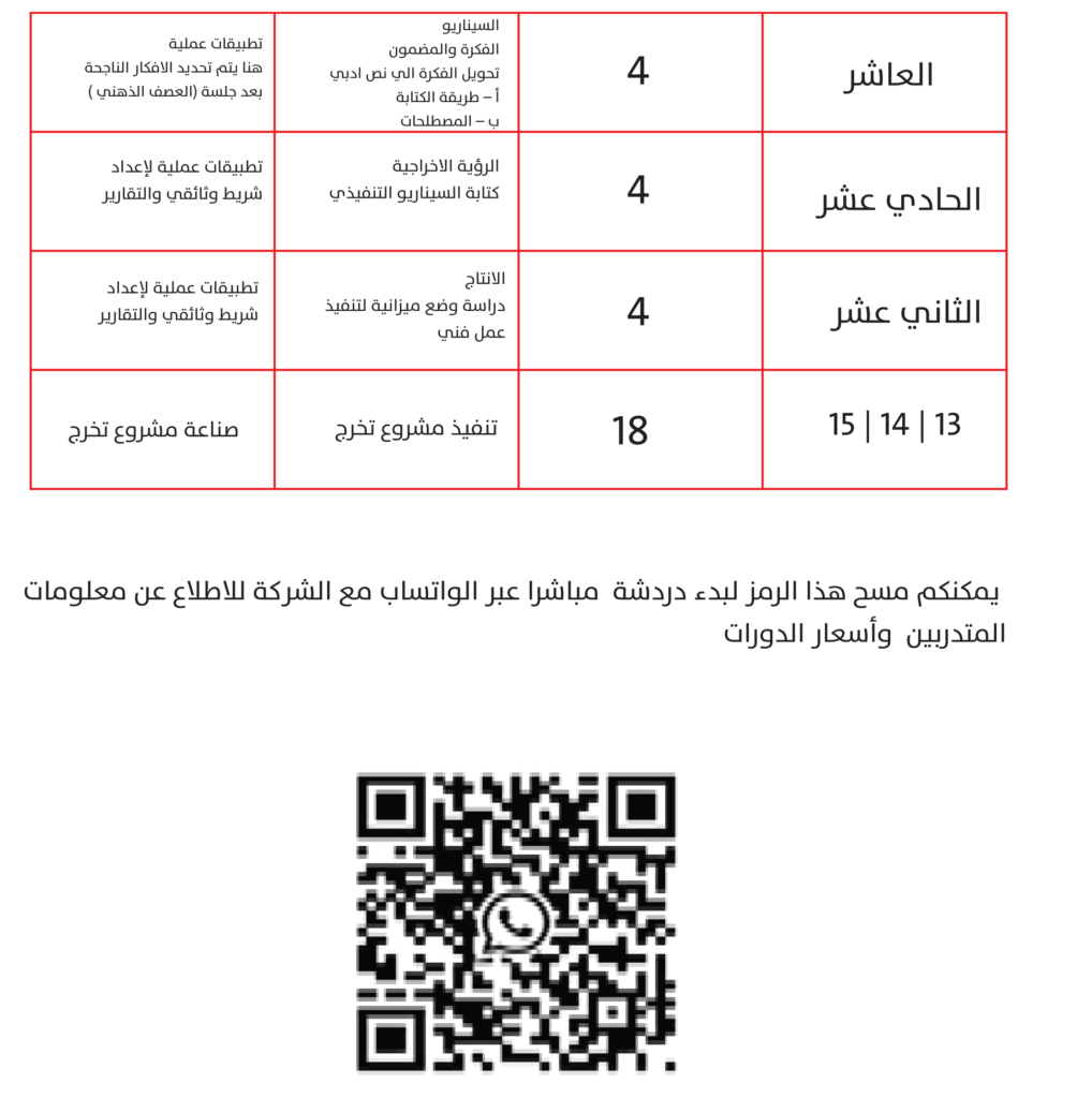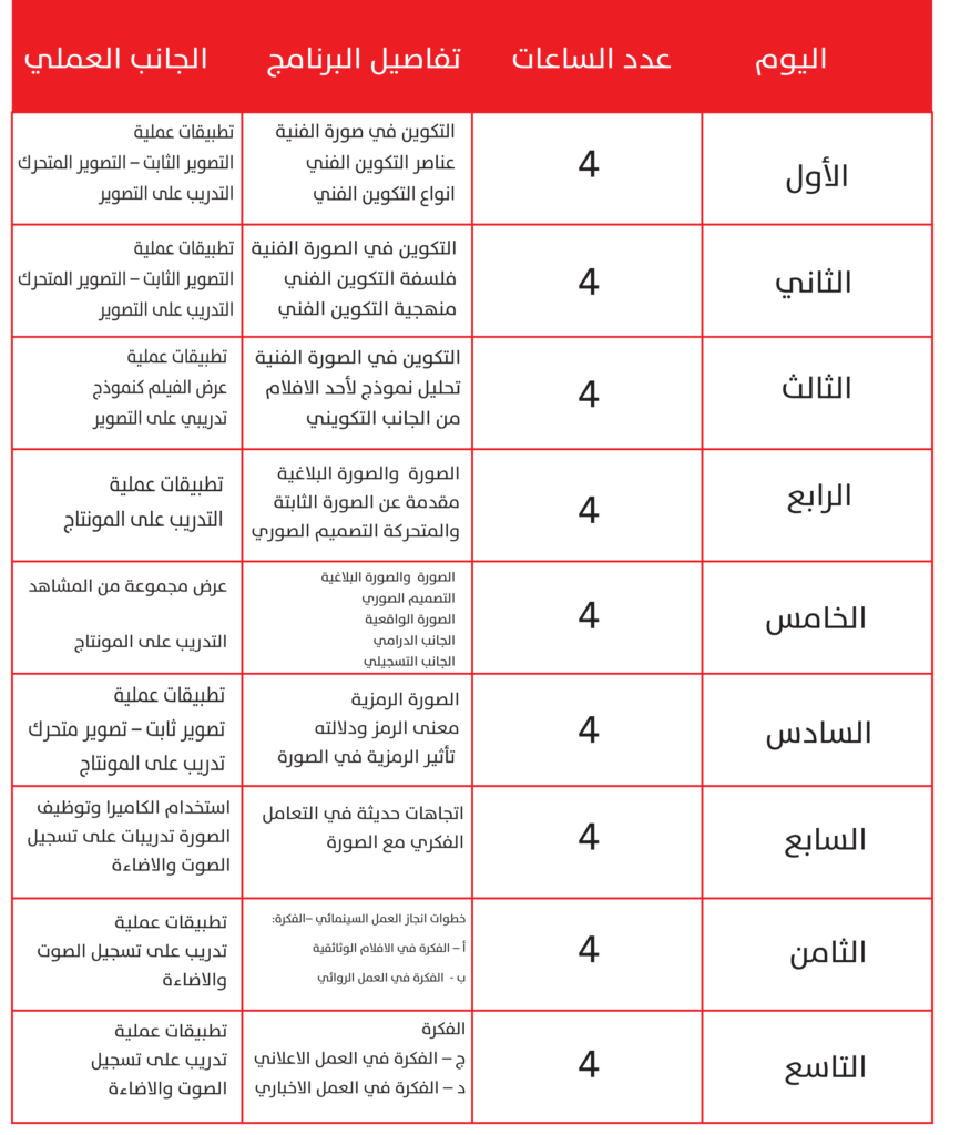 البرنامج التدريبي ينتج كوادر قادرة على انتاج اشرطة في مجال التوثيق و اعداد التقارير و فيه يتم توزيع عدد ساعات التدريب و المحاور لمدة 12 يوما و بعدد اجمالي 48 ساعة تدريبية و 3 ايام خاصة بمشروع التخرج مقسمة على 18 ساعة